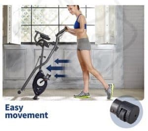 It is a compact and foldable bike that can easily fit in a small room or apartment and will be liked by those that want portable stationary exercise bike. The overall assembled dimensions are 42.5 inches long by 21.5 inches wide by 41 inches tall. This means a workout area of 3 feet 5 inches long by 1 foot 8 inches wide will be required.